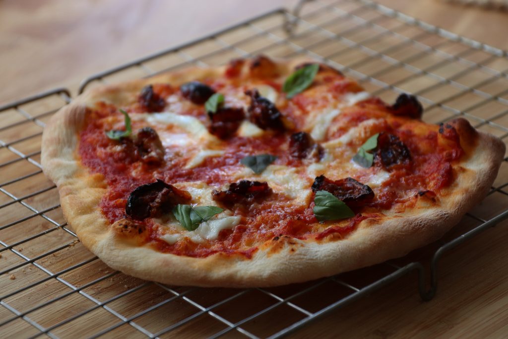 Pizza toppings should always be cooked or marinated, as raw vegetables will render water into your pizza dough and prevent it from crisping up as it should. Sundried tomatoes, marinated peppers and anchovies work brilliantly for this reason. Beware of very wet mozzarella, it can be helpful to drain it on kitchen paper before adding to the pizza. Add any fresh toppings such as rocket, basil or parma ham once the pizza is out of the oven.